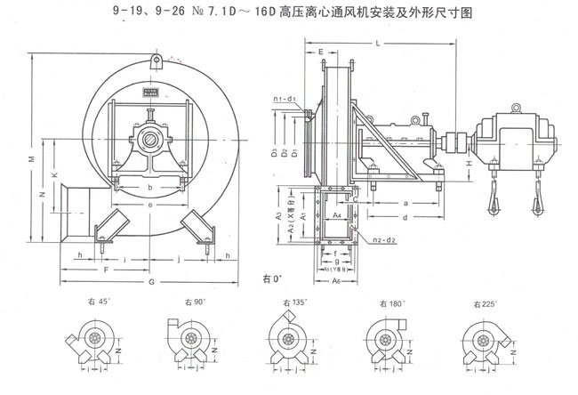 90О、135О、180О、225О<BR>2.說明:本系列風(fēng)機(jī)使用氣體溫度低于150℃,含塵量應(yīng)小于150mg/ M3.